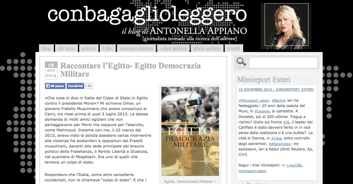 Eppure, in Italia, se cercavi di affermare il contrario eri zittito, spesso attaccato. Per fortuna, Giuseppe Acconcia non si è fatto zittire, non si è “allineato” e ha scritto un libro dal titolo volutamente provocatorio: “Egitto – Democrazia militare”, il primo libro onesto che ho letto sull’Egitto e i suoi cambiamenti negli ultimi quattro anni. Il primo che racconta come il Movimento di piazza si sia trasformato in un Colpo di Stato Militare e come il Paese viva ormai in una condizione di completo controllo politico, sociale e di dura repressione sotto la presidenza di Abdel Fattah al-Sisi: ex generale e membro del Consiglio supremo delle Forze armate eletto, con un voto boicottato dalla maggioranza degli egiziani, il 27 maggio 2014. […]